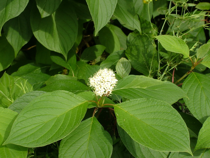 Dereń rozłogowy - łac. Cornus stolonifera rodzina: Dereniowate - łac. Cornaceae Kwitnie od czerwca do lipca Rośnie na brzegach strumyków, w lasach, zaroślach; jest często sadzony w parkach. Ma białe kwiaty i owoce; pędy - jesienią - są czerwone. owoce